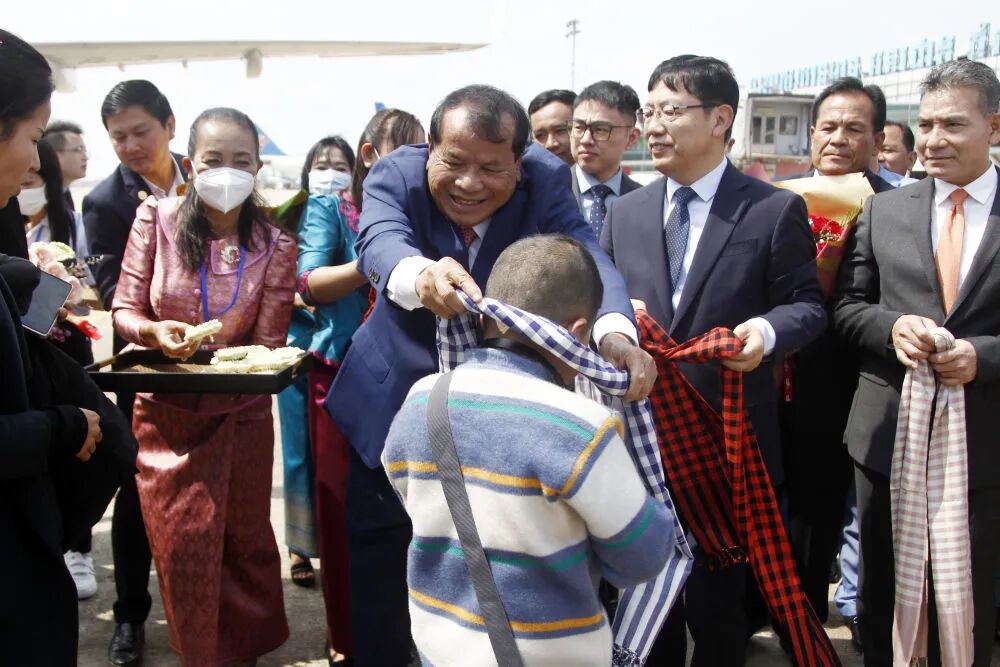 飞机停稳后,等待乘客们的是两排欢迎人群。伴随热情的柬埔寨传统舞蹈昌扬舞,柬埔寨旅游大臣童昆和中国驻柬埔寨大使王文天向中国客人逐一送上柬埔寨传统水布和花环,给予他们热烈欢迎和诚挚祝福。童昆在欢迎仪式上说,中国恢复出境旅游对柬埔寨和世界经济都非常有利。今年,柬埔寨将争取吸引80万至100万中国游客。柬旅游部表示,热烈欢迎中国游客的到来并已做好充分准备。