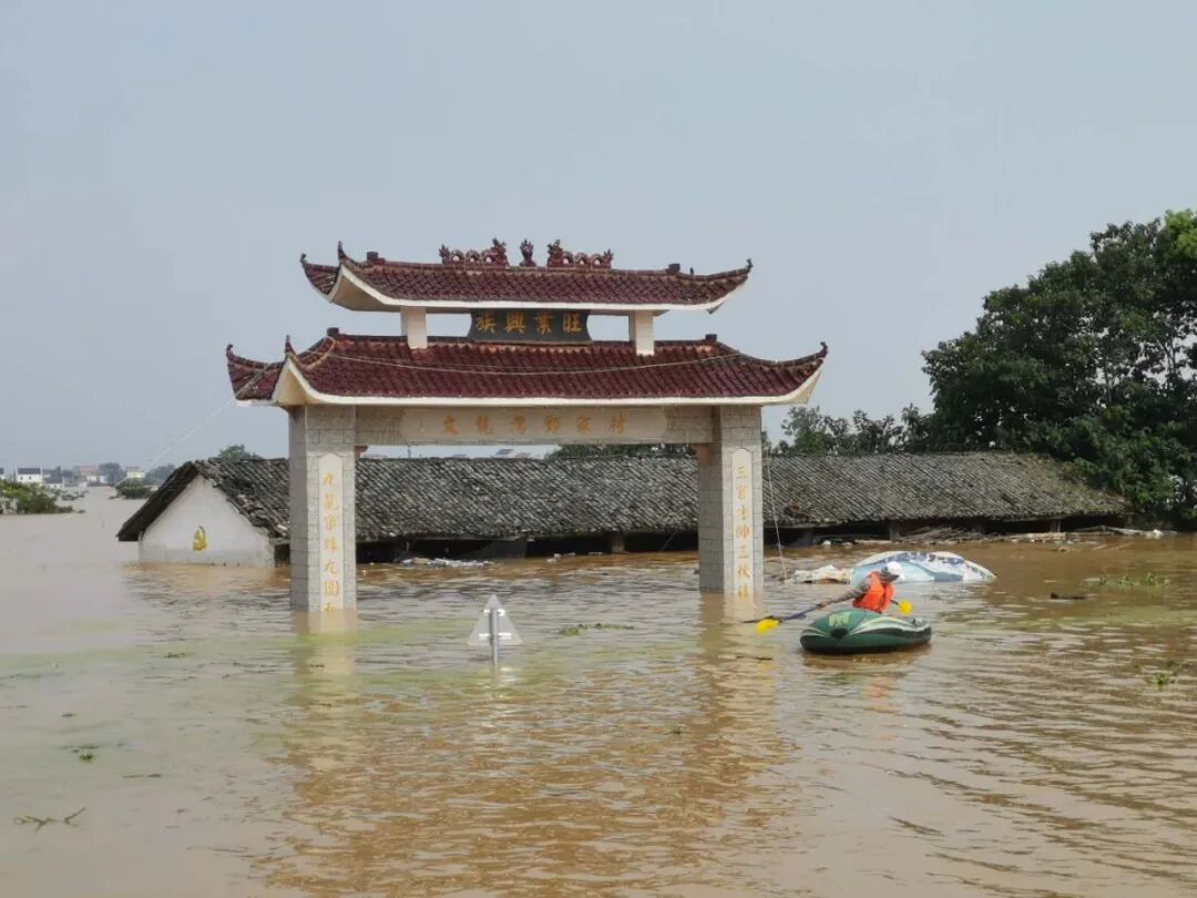 在问桂道圩不远处的邓家村村口,洪水已将村口牌坊淹没过半。一名从安置点赶回来取东西的40多岁的村民指着牌坊面无表情地说,那里过去是他的鱼塘。洪水一来,鱼苗全部被重走,“损失有十几万吧”,家里另有30多亩的水稻被淹。