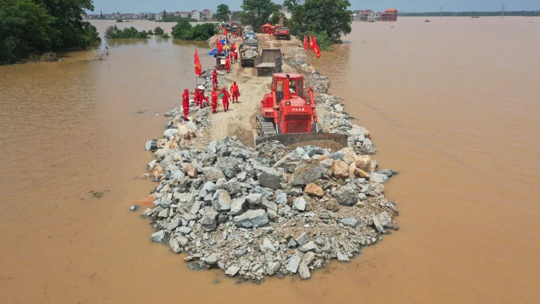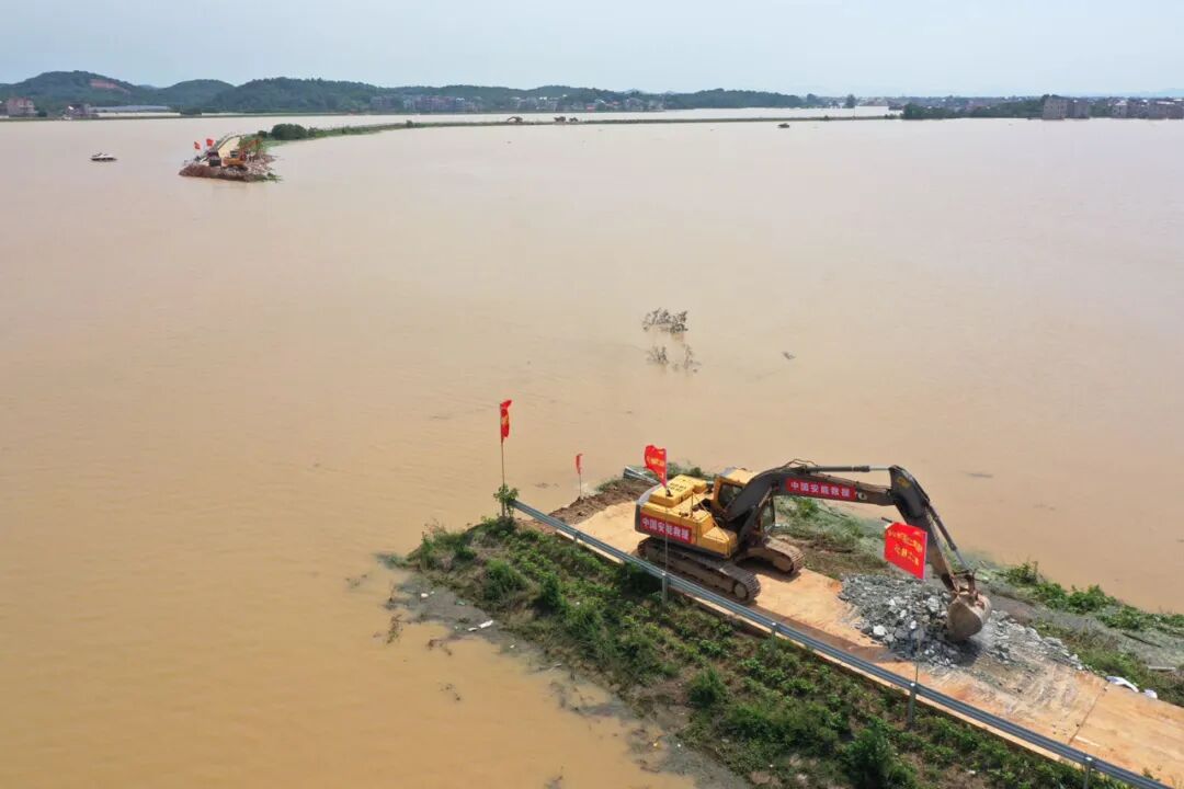 这已是近期连续几日的晴天后出现下降的水位。最高时,昌江水位一度达到23.43米,超过1998年最高位23.18米。问桂道圩、中洲圩先后在7月8日、9日决堤,率先拉响了防汛警报,鄱阳县紧急将防汛应急响应提升至Ⅰ级。7月13日,本刊记者乘坐冲锋舟进入受灾现场,看到中洲圩堤决堤口长达170多米,远看上去像是一个水中“断头桥”,舟行其间畅行无阻。在问桂道圩决堤处,长达127米的决堤口正被来自中国安能公司的抢险救援队逐步填充、合龙,运送砂石的小型卡车伴着平整土地的推土机一起轰鸣,与抢险指挥的哨声、砂石倾倒声一起,工程响声震天,搅动着静默的江水。