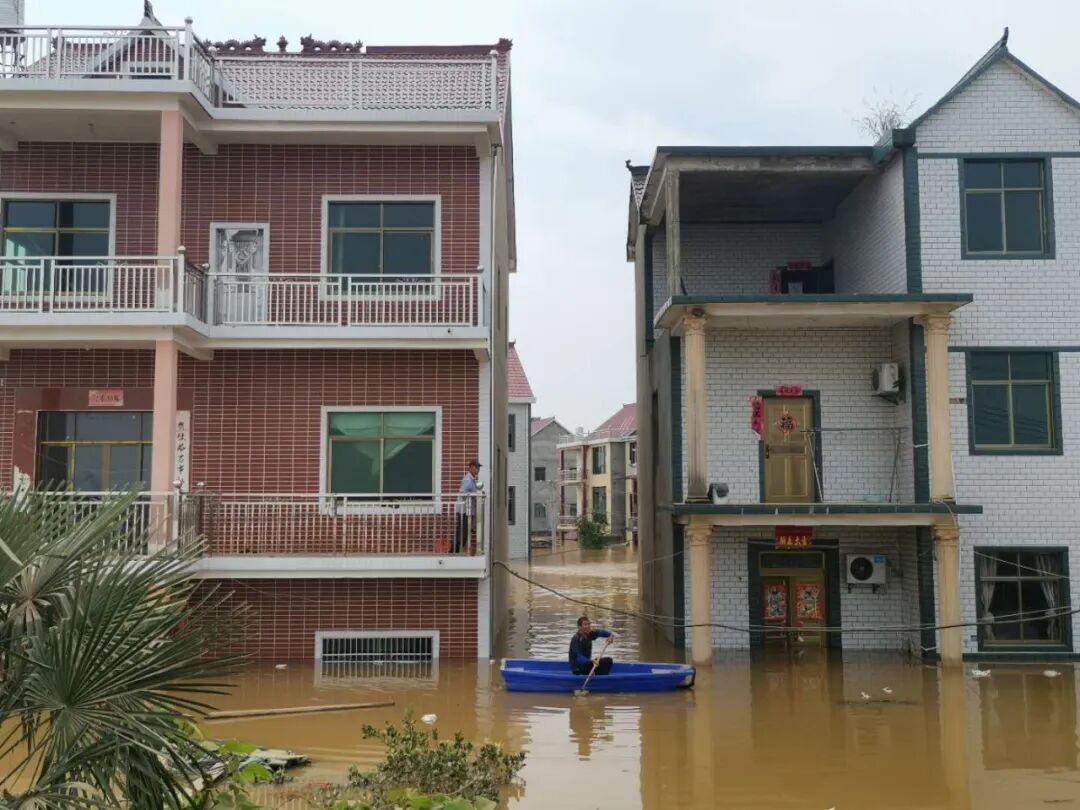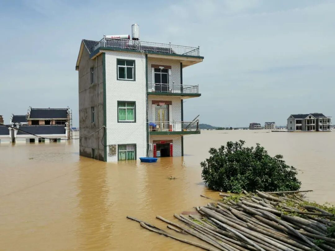附近的村庄则都是沉默的。现场是一片泥黄色“汪洋”,村民们的三层小楼中,一楼普遍陷在水中,平房则只剩下屋顶,甚至全部覆没、沉陷、浸泡着。从安置点赶回的村民们,只有乘坐木筏或塑料小船,翻上二楼阳台,从家里搬出必要物品,带着锅碗瓢盆、鸡鸭家禽去投奔亲友。洪水蔓延在过往的乡间小道上,代替了南方农村夏日的绿色,让这里成了一座汪洋中的“水城”。身在其中的每个建筑,看上去都是一座孤岛。