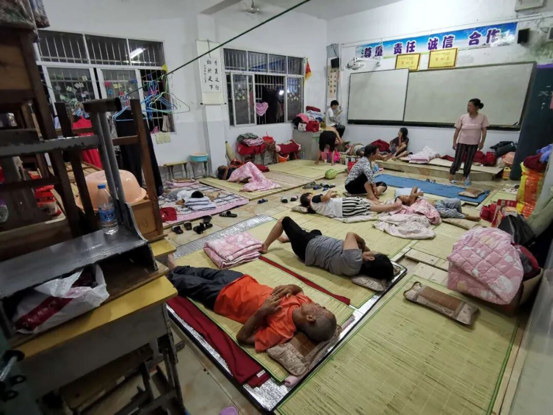 在安置点的村民们,很多都是老人与孩子,黄能先就是其中一员。他与20多位村民们挤在一间教室内,吃学校食堂提供的饭菜,用当地政府为他们配备的基本生活用品。与黄能先共处一个教室的,有一位50多岁的大妈,带着4个不足10岁的孙子孙女,她要不停地让精力旺盛地孩子们保持安静,不要打扰他人;一旁熟睡着一位90多岁的老人,看起来十分衰弱,一直躺在地上休息,缄默少语。这些,都是黄能先在村里的邻居。