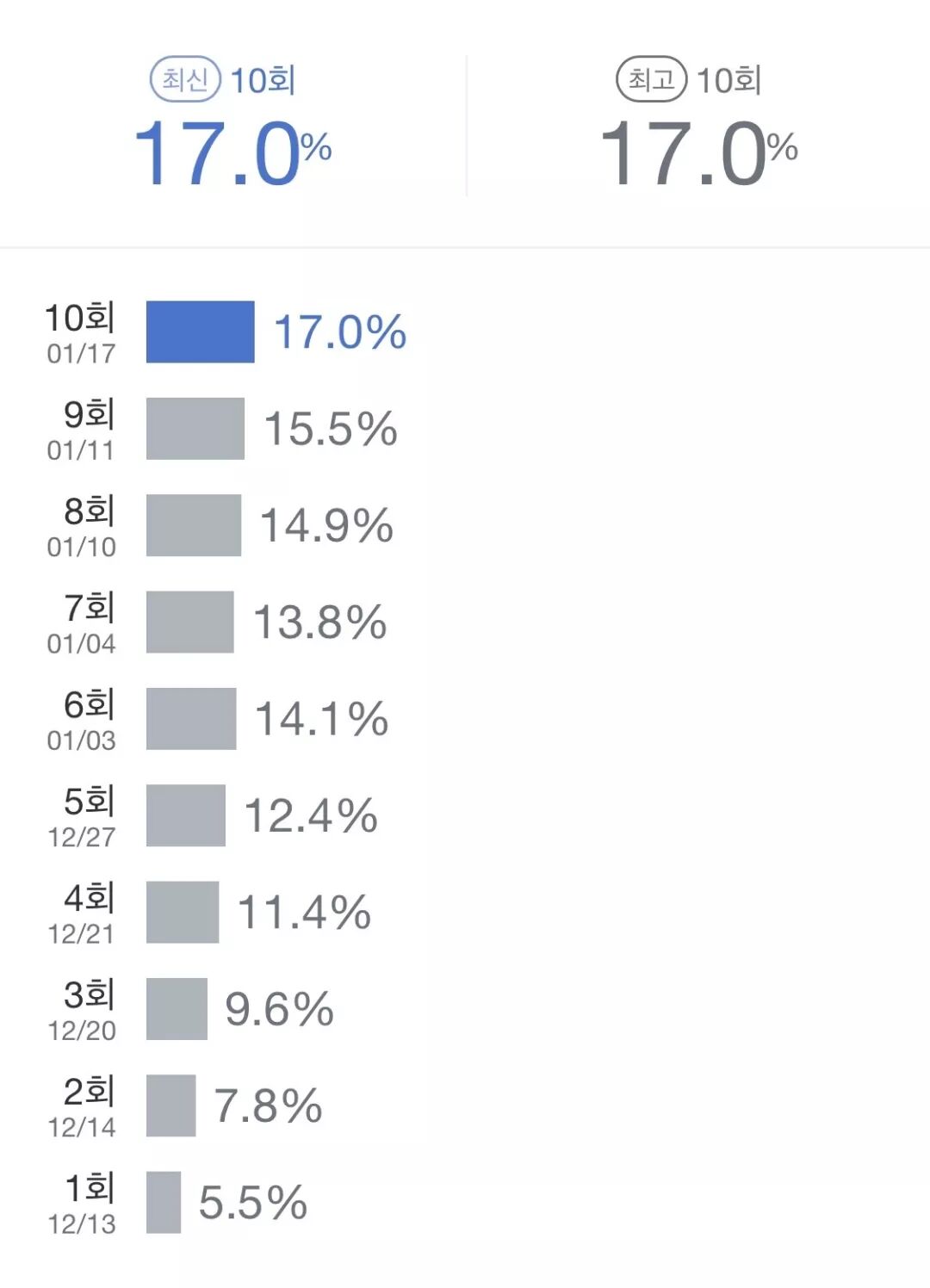 收视方面,首播5.5%的成绩,到如今的第10集,已经猛增到了17%——几乎每一集都在刷新上一集创下的最好成绩。