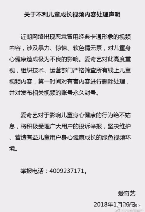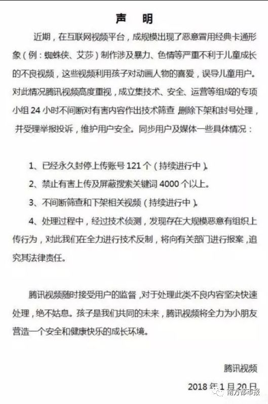 “我们将持续关注,对不履行企业主体责任,造成有害视频及信息传播的企业,一经查实,必予严惩。2018年,全国“扫黄打非”办公室将继续开展“护苗2018”专项行动,重点清理涉未成人有害出版物及信息,严厉打击相关违法犯罪活动,希望广大网民积极举报涉“黄”涉“非”不法行为。”全国“扫黄打非”办公室表示。