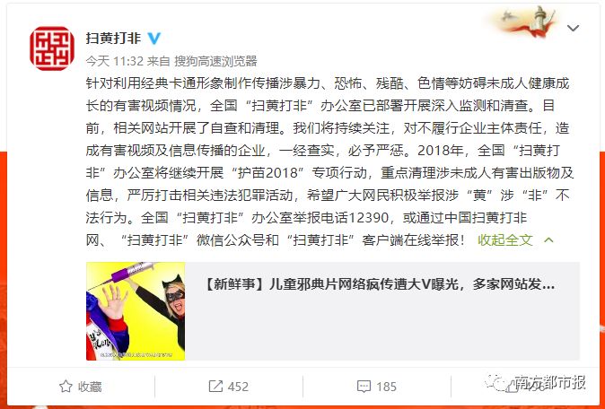 1月21日上午,全国“扫黄打非”办公室官方微博发文称,针对利用经典卡通形象制作传播涉暴力、恐怖、残酷、色情等妨碍未成人健康成长的有害视频情况,全国“扫黄打非”办公室已部署开展深入监测和清查。目前,相关网站开展了自查和清理。