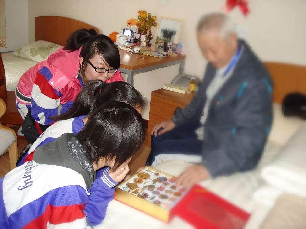 早些年,一次中午我去看看老人睡了没有,有一位老人东跑跑西跑跑。我说奶奶,你干吗呢。她说,有特务,好几个人呢。我一边想,一边说,奶奶,我是党员,这个事您就交给我了,我向党组织汇报,一定会解决的,您放心吧。于是她就顺从地回去睡午觉了。