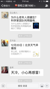 这下面其实就是我们双井恭和苑的“恭和之家”的老人群。微信群可热闹了,为老年人开辟了新的交流空间。家属也会参与进来,来自各路的信息互相交流,增加了和社会接触互动的一个窗口。