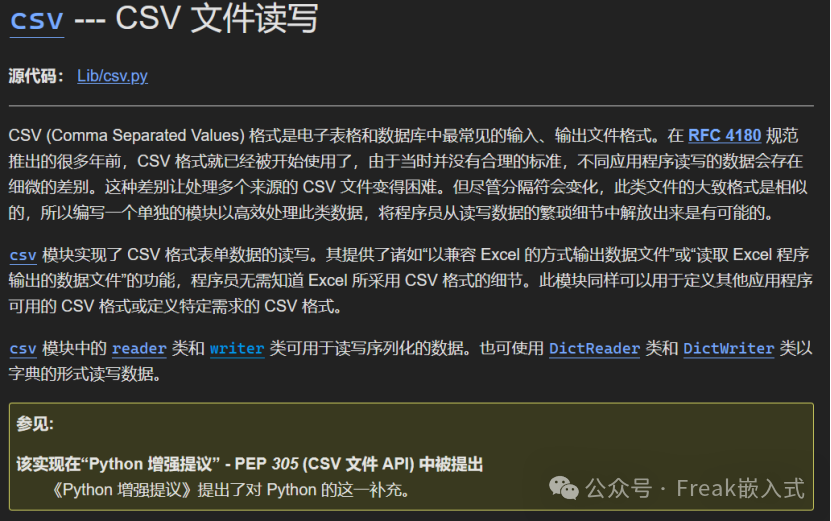 操作csv文件我们需要借助csv模块,python自带csv模块,不需要我们使用pip安装,我们可以点击如下链接查看csv模块使用方法: