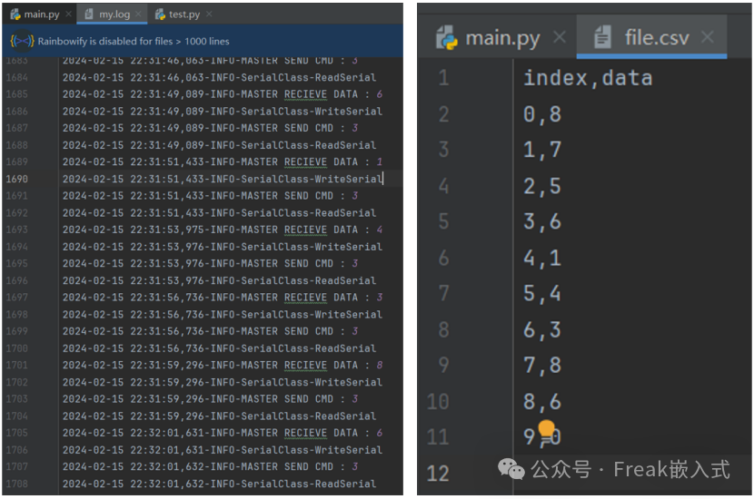在主程序中,我们在主机接收10次数据后,将数据保存到file.csv中: