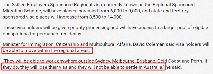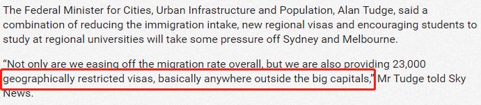 首先,人口部长称,两个regional签证是“受地域限制”的签证,而地域范围,即为悉尼,墨尔本,布里斯班,黄金海岸,珀斯这些大城市之外的地区。