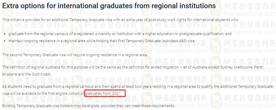 此外,移民局表示,满足相关要求的目前的485签证申请人也有可能申请到多1年的485签证,目前的485签证持有人最晚为今年年初的毕业生,那这说明额外的1年485和什么时候去偏远地区入读没有关系。