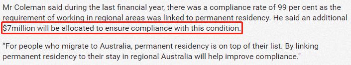 而未来,移民局将会投入7百万澳元来监管准移民,确保准移民在regional地区工作生活。