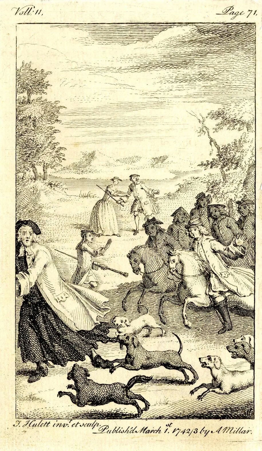 约瑟夫是帕梅拉的哥哥,从小就在布比家做仆人。布比先生是《帕梅拉》中的B先生的叔父,萨默塞特郡的大地主,准男爵(baronet),头衔够不上贵族院的席位,但可以世袭。约瑟夫刚来布比家的时候,派在果园里赶鸟。他有一条好嗓子,应该很适合这个差事。可是他的声音过于甜蜜,一吆喝,不但停在树上的鸟不走,本来在园子外边的也飞进来了。于是就改派他给司狗的当助手。所“司”的是猎狗,——猎狐是当时乡间绅士喜好的消遣,通常要用十几、二十条狗,司狗的用号角或者哨子发令。[10] 约瑟夫的嗓音比号角高亮圆润,猎狗听见就分心。司狗的仆人自然不高兴,布比先生就把约瑟夫调到马号去了。约瑟夫在马号是得其所哉,因为他的骑术极好。乡间的绅士经常赛马,——这是兼带赌博的运动,约瑟夫无往不胜,下注的人都要先问清楚哪匹马是他骑的。他还有更露脸的事,——拒绝贿赂,给多少钱都不作弊。布比太太知道了这件事,认为约瑟夫诚实可靠,就把他要过去做跟班。布比先生夫妇每年天气暖和的时候,住在伦敦,享受都市生活。约瑟夫当了跟班,就随同前往。约瑟夫到了伦敦以后,有了一些变化。以下是菲尔丁的描述: