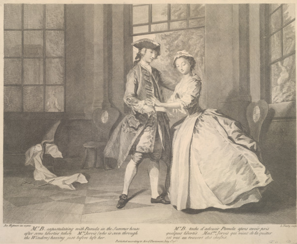 女宾们的品评,并不暗示帕梅拉真的出身高贵。理查逊不相信人的品位高下有种,可以世代相传。B先生之所以对帕梅拉一见倾心,是因为她被老夫人长年调教,耳濡目染,已经完全是一副大家闺秀的样子。小说开篇,就对此有所申明。帕梅拉在第一封信里说,她服侍老夫人,除了写信、记账、弄弄针线,所学的其他事情,都远不合一个仆人的地位,要是被遣散,很难再到别的人家帮佣。她在第29封信里,想像还乡之后的尴尬,说得更加具体:“就连村上的人庆祝五朔节,我都无法参与。因为我一直跳的舞式,是米奴哀、利戈顿,还有各种法国舞,跟那些挤奶姑娘跳不到一起。”又说:“我在书里看过,有一位了不起的主教,因为信仰将受烧身的极刑。事前为了考验自己的坚韧,他把手指伸进烛火里去烤。前天,厨房里的下女莉切尔把一个锡镊盘子刷洗了一半走开了,我就想试试自己能不能干这一类活。我发现我能行,虽然一下一下地,干得慢一点儿。只是手上磨出了两个水泡。”
