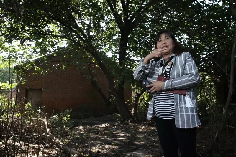 温合花站在自己当年被李含富家族霸占的厂子里,给记者介绍他们如何霸占自己的厂子,以及在内蒙“逃亡”的种种。当年的厂子现在已经变成了“森林”。 新京报记者 尹亚飞 摄