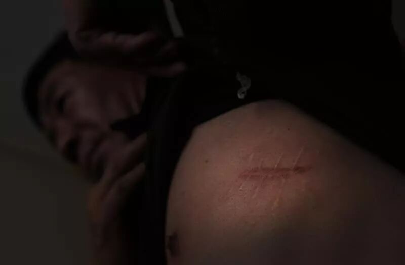 贾广日向记者展示2008年自己遇刺的伤疤。 新京报记者 尹亚飞 摄