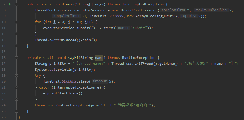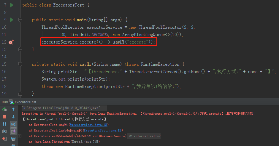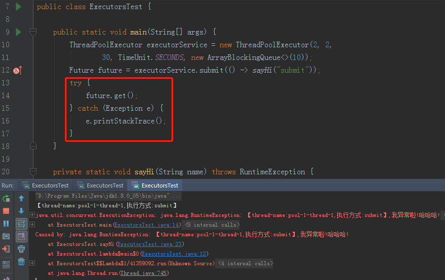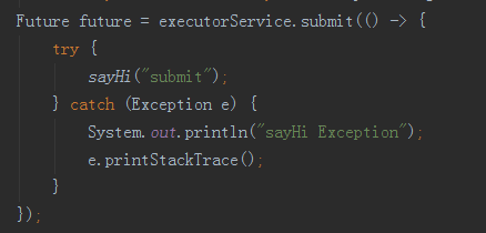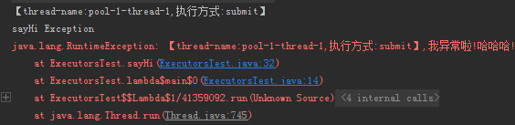 如果提交的任务( sayHi 方法)抛出的运行时异常没有被捕获,则会在标号为 ② 的这个 catch 里面被捕获。然后执行标号为 ② 的这个代码。