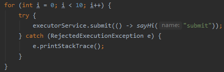 在循环体中扔 10 个比较耗时的任务进去。有 3 个任务它处理不了,那么肯定是会触发拒绝策略的。