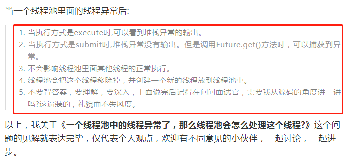 他说:牛逼呀,确实是这样的。那你的这个面试题是有问题的啊,描述不清楚,正确的描述应该是一个线程池中的线程抛出了未经捕获的运行时异常,那么线程池会怎么处理这个线程?