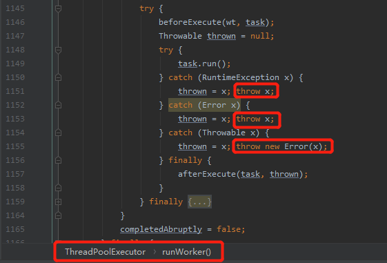 如果提交的任务( sayHi 方法)捕获了运行时异常,则会进入标号为 ③ 的这个逻辑里面。