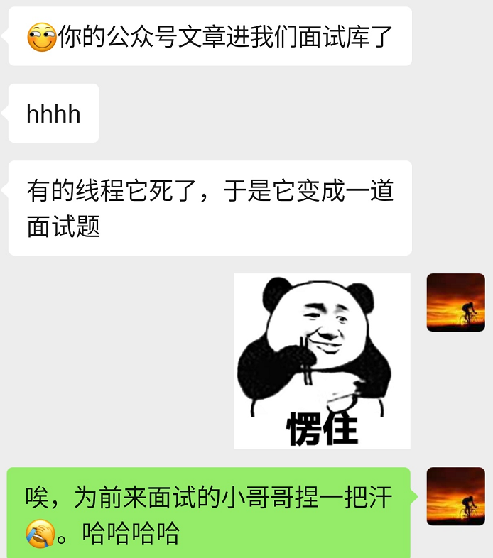还记得我之前《有的线程它死了,于是它变成一道面试题》这篇文章中的一个对话截图吗: