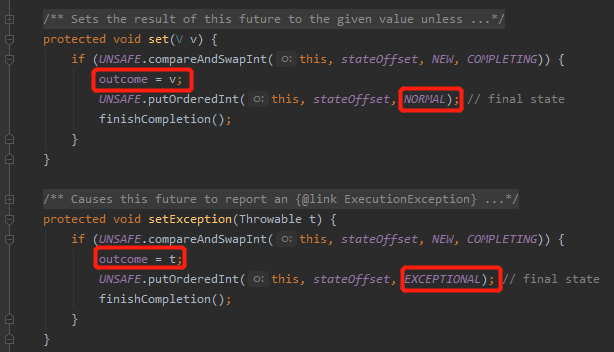 首先,两个方法都是先进行一个 cas 的操作,把当前 FutureTask 的 status 字段从 NEW 修改为 COMPLETING 。