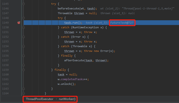 然后直接在 runWorker 方法的 task.run 方法处打上断点: