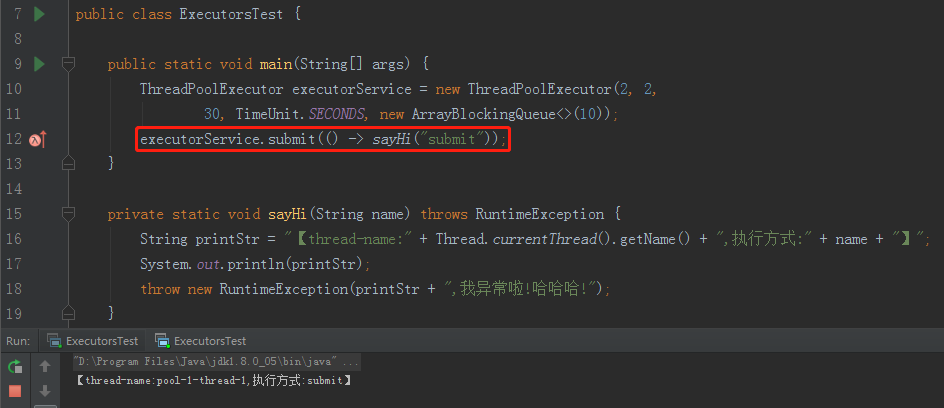 现在是用 submit 的方式往线程池里面提交任务,而执行的这个任务会抛出运行时异常。