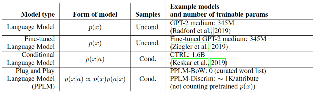 受到 CV 领域 PPGN(Plug and Play Generative Networks)的启发,通过插入属性判别模型来引导模型生成特定属性的文本的 PPLM 应运而生。PPLM 作者按照场景将语言模型进行如下分类:![]()