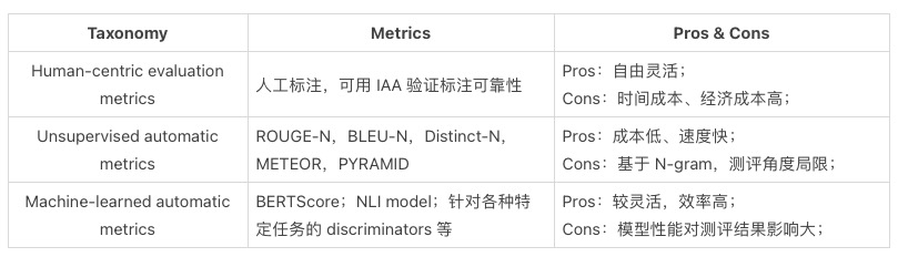 针对文本生成的评价指标,已有多年研究。根据不同的维度,可以对现有评价指标有着不同的分类。比如,部分评价指标仅考虑所生成的文本,来衡量其自身的流畅度、重复性、多样性等;另一部分指标还考虑到了源文本或目标文本,来考察所生成的文本与它们之间的相关性、忠实度、蕴含关系等。此处,我们从执行评价的主体类型进行分类,来梳理当前常用的文本生成的评价指标:- Human-centric evaluation metrics
