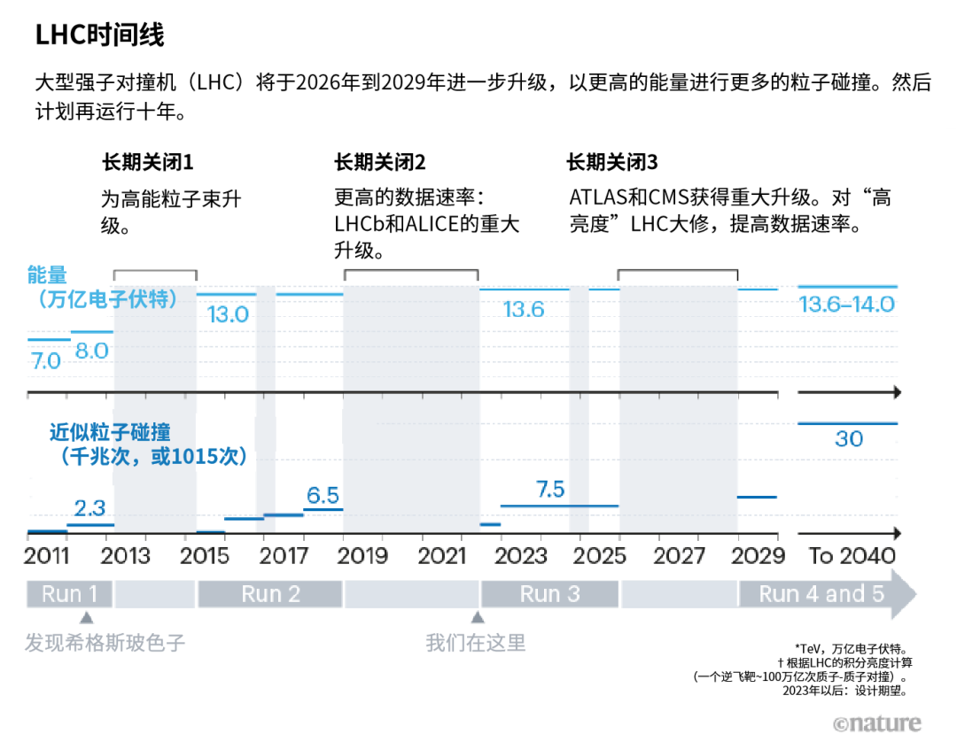 第三次运行还将进行全新的实验。距离ATLAS半公里的FASER,将寻找轻的、参与弱相互作用的粒子,包括中微子和可以解释暗物质的新现象。(这些粒子无法被ATLAS发现,因为它们会依靠近LHC束管的轨迹飞出对撞区,逃过探测器)。与此同时,ATLAS和CMS实验现在已经改进了探测器,但在2026年的下一次长期关闭之前不会进行重大硬件升级。此时,LHC将进行大修以产生更集中的“高亮度”粒子束,这将持续到2029年(见“LHC时间表”)。这将让科学家在后续运行中收集到的对撞数据,比第一至第三次运行总和多10倍。目前,CMS和ATLAS已经拥有原型技术来帮助他们做好准备。
