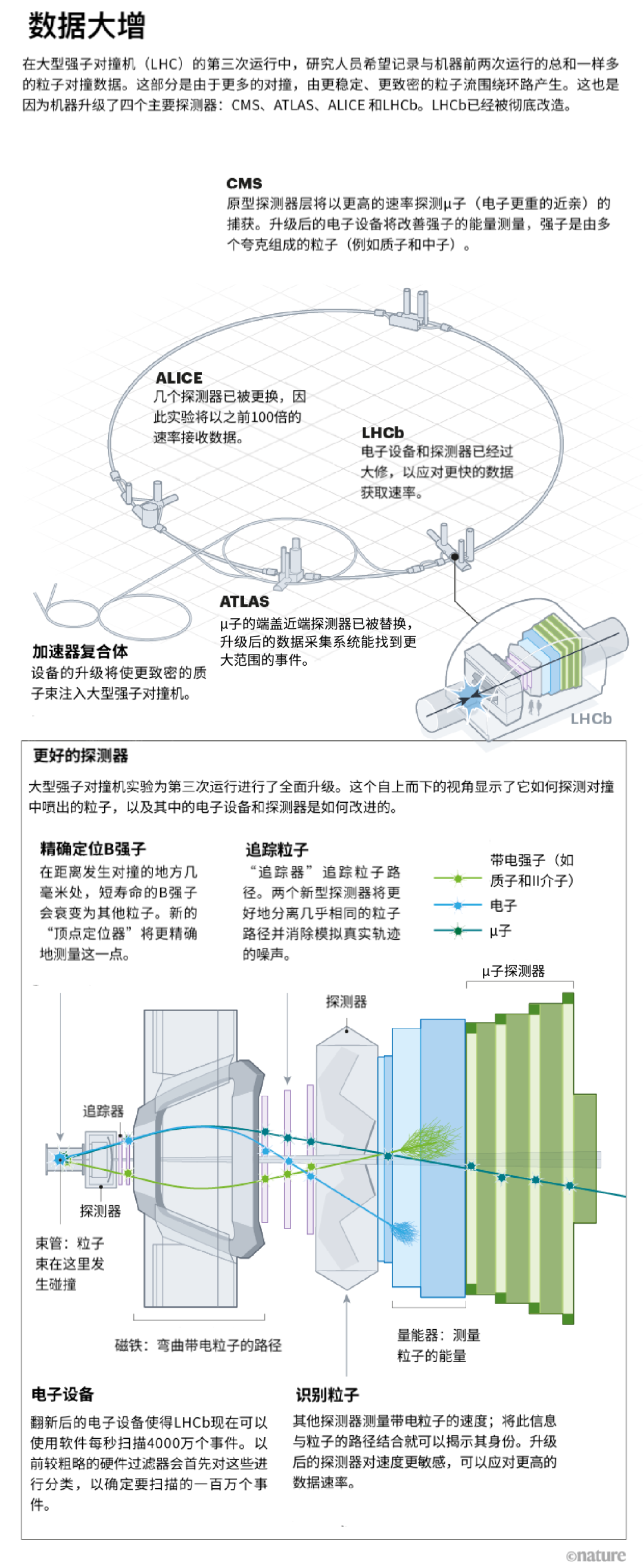 为了应对粒子洪流,机器的检测器——即传感器层,用于捕获从对撞中喷出的粒子并测量它们的能量、动量和其他特性——已经升级,以提高它们的效率和精确度(见“数据大增”)。