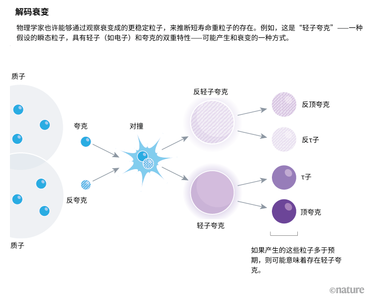CMS和ATLAS还要做LHCb无法做到的事情:梳理对撞数据,直接寻找理论界认为可能导致尚未证实的反常现象的奇异粒子。其中一种这样的假设粒子被称为轻子夸克(leptoquark),因为它在高能状态下会呈现出两种截然不同粒子家族的特性——轻子,如电子和μ子,以及夸克(见“解码衰变”)。这种混合粒子来自于寻求将电磁、弱和强基本力结合为同一种力的理论,并且可以解释LHCb的结果。轻子夸克——或它的复杂版本——也符合另一个诱人的反常现象。去年,来自费米实验室的μ子g - 2实验的测量结果[3]表明μ子的磁性比预期的要强。