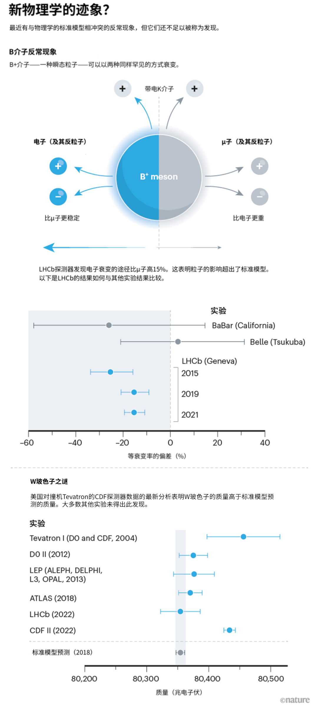 但物理学家们也想知道最近的一系列奇怪结果是否是真正的反常现象,这可能有助于填补对理解宇宙的一些空白。标准模型是不完整的:例如它无法解释暗物质等现象。在过去的两年里,与模型相矛盾但又不足以被当作明确差异的情形,已经出现了很多次(见“新物理学的迹象?”)。
