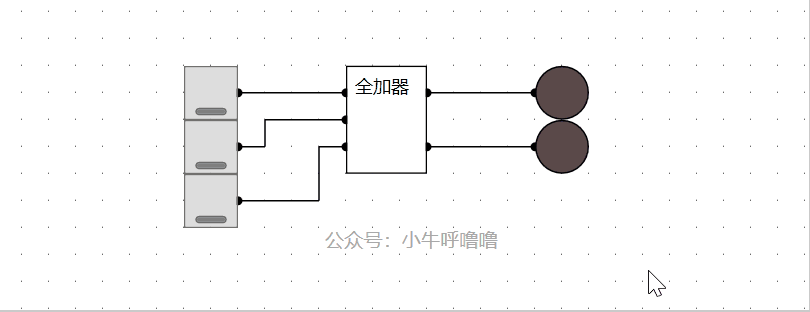 当输入3位数中,任意1位为1的话,不会触发进位,结果为1;任意2位为1的话,必有一个半加器进位,结果为2;当3位都是1个话,会触发2次进位,但由于有或门的存在,会保证最终只有一个进位,这也就保证了结果为3。我们将这个电路封装一下,模拟一下效果: