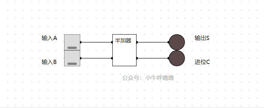 半加器,指对两位二进制数实施加法操作的元器件。它具有2个输入端A和B,还有输出端S,进位数C