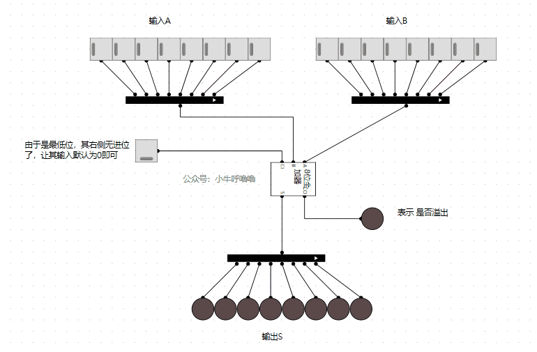 需要注意的是,这种串联全加器,在最低位,没有来自更右侧的进位了,我们让其进位输入始终是0即可。在最高位的输出进位信号,不仅表示的是进位信号,还更是是否溢出的标志。当这里大家终于明白了计算机为什么能自动地识别加法结果是否溢出了:从硬件层面,当加法结果溢出时,电路就会产生溢出的信号,这也是我们现代计算机的判断溢出的原理,让笔者不禁感叹真是玄妙啊!