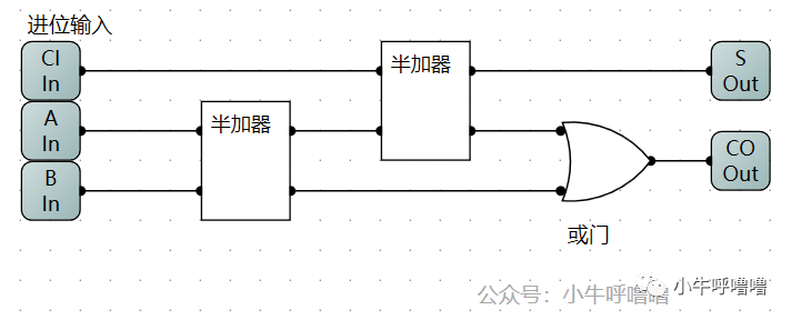 半加器能产生进位但是不能处理进位,这个时候全加器就应运而生了。它们本质上是一样的,半加器不能处理进位的原因是由于,当加数和被加数之和达到二位时,还需要再加上来自个位的进位信号,也就是说一共需要三个数进行相加,才能得到结果。也就是说将两个半加器和一个或门,就能组合成一个全加器。