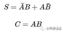 观察A、B与S,A、B与C的关系,我们很容易就找到他们之间的关系表达式:有了表达式,我们发现AB可以通过异或门得到S,从而实现最简单的整数加法, 我们也就能画出其电路图了