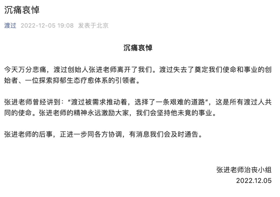 张进老师如今更被人熟知的身份是“渡过”创始人,一位倔强和抑郁症抗争并将抗抑经验分享给大众的斗士,一位畅销心理作家。今天“渡过”公号的讣告写到,“今天万分悲痛,渡过创始人张进老师离开了我们。渡过失去了奠定我们使命和事业的创始者、一位探索抑郁生态疗愈体系的引领者”。