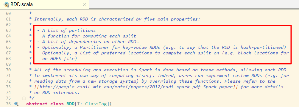 在源码中可以看到有对 RDD 介绍的注释,我们来翻译下: