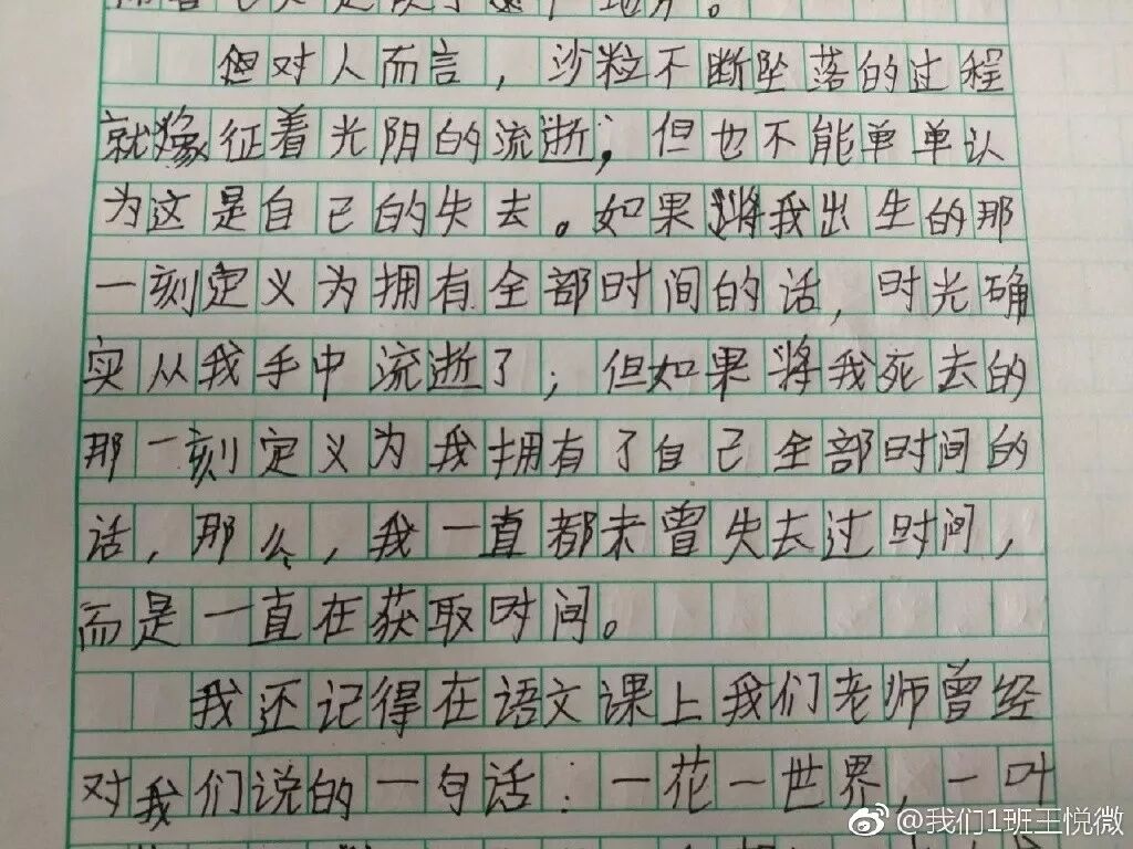 浅黄色的格子作文本上,一个六年级男孩这样理解时间——“对人而言,沙粒不断坠落的过程就象征着光阴的流逝,但也不能单单认为这是自己的失去。如果将我出生的那一刻定义为拥有全部时间的话,时光确实从我手中流逝了;但如果将我死去的那一刻定义为我拥有了自己全部时间的话,那么,我一直都未曾失去过时间,而是一直在获取时间”。