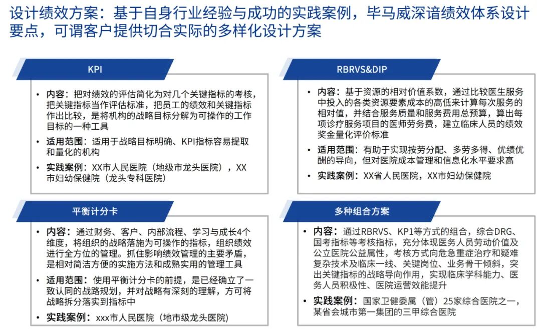 为适配医院经营问题的多元性和复杂性,毕马威采用定制化解决方案,综合运用各类方案,有针对性地解决问题。开展针对医、护、技、行政的岗位职责及工作性质,设计相对应的绩效考核方案。形成以工作量,工作难度和风险,工作质量,成本管控,医保管理、运营分析为核心的绩效方案体系。同时,综合研判医保支付改革、药品耗材集中带量采购、医疗服务价格改革、薪酬绩效制度改革等重点政策导向和发展趋势,预置政策改革空间,使绩效管理既符合政策需要和医院发展又能提升员工积极性和满意度。