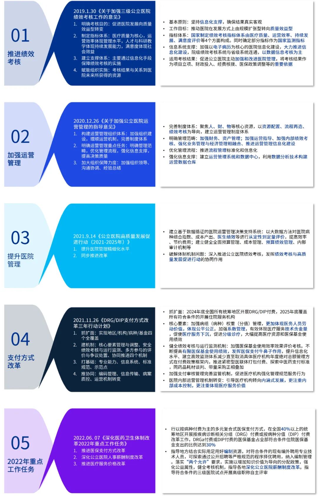 近年国家密集出台各类政策,逐步推进公立医院运营管理模式现代化革新。2017年国家四部委发布《关于开展公立医院薪酬制度改革试点工作的指导意见》,明确指出要“建立符合医疗行业特点、体现以知识价值为导向的公立医院薪酬制度”。国务院办公厅于2019年印发《关于加强三级公立医院绩效考核工作的意见》,首次从中央层面提出以绩效考核为抓手,加强对三级公立医院的管理,引导三级公立医院进一步落实功能定位。《意见》提出, 要明确考核目的,创立指标体系,以信息化手段保障绩效考核的实施,用考核结果赋能组织实施。公立医院需要紧跟政策脚步,构建全方位的绩效管理体系,激发全员活力,助力高质量发展。