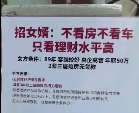 真人真事!近日,在上海著名的相亲角,一位阿姨开出征女婿贴,要求具有3年以上金融投资相关经验,理财组合年化10%,可提供交易记录、业绩证明优先。