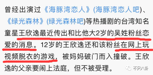 2007年,年仅12岁的王欣逸被曝与14岁女粉丝谈恋爱,两人还在网上脱衣裸聊,被王欣逸妈妈撞个正着。