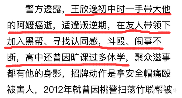 警方透露,王欣逸由奶奶一手带大,青春期叛逆又逢奶奶病逝,让王欣逸彻底自暴自弃:休学、打架、加入黑帮。