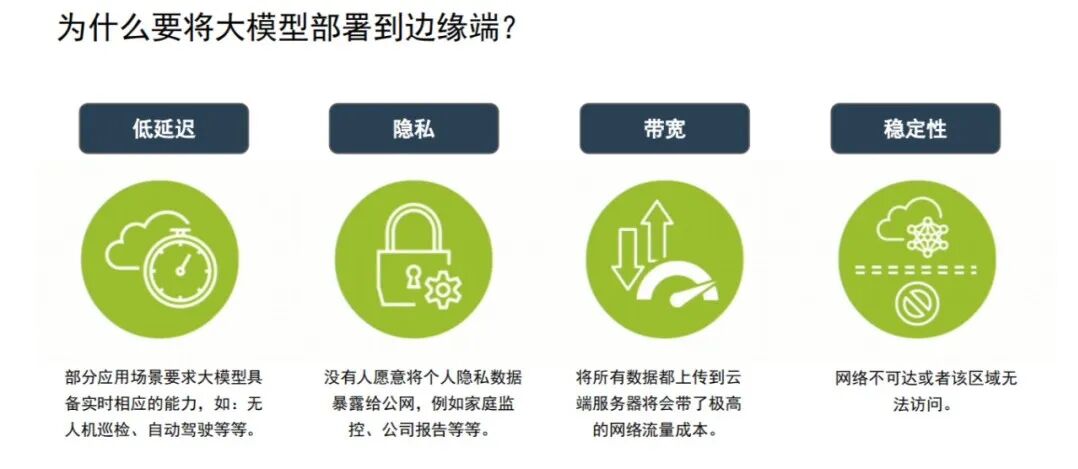- 为什么要把大模型部署到边缘硬件设备:云端服务存在弊端,包括延迟、隐私、稳定性等问题。例:客户是政府,可能会对采购的硬件产品有很多的安全评估。如果需要插入网线,工作量就会很大;如果只需要插电源,且设备是单机的,可以节省很多工作,且不需要花钱购买流量,也不存在网络不可达的问题。