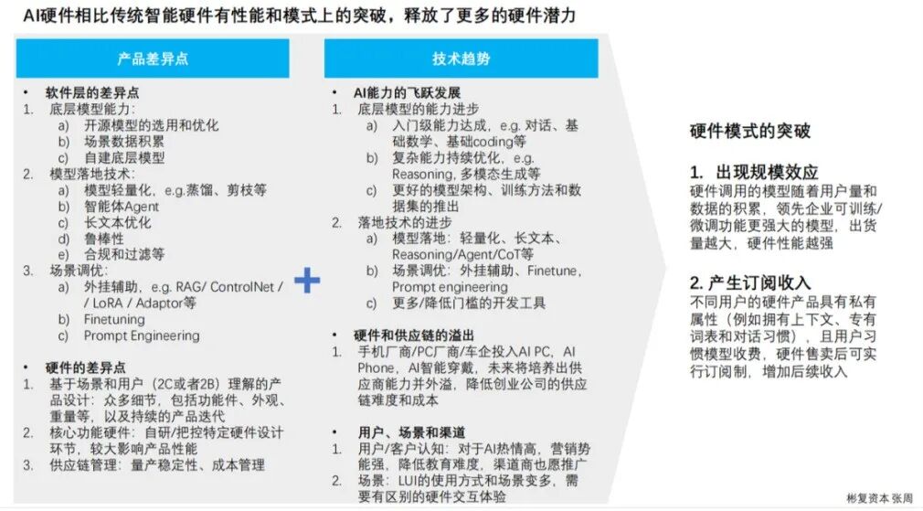 - 规模效应不再单单依赖供应链:硬件调用的模型随着用户量和数据的积累,领先企业可训练微调功能更强大的模型,出货量越大,硬件性能越强