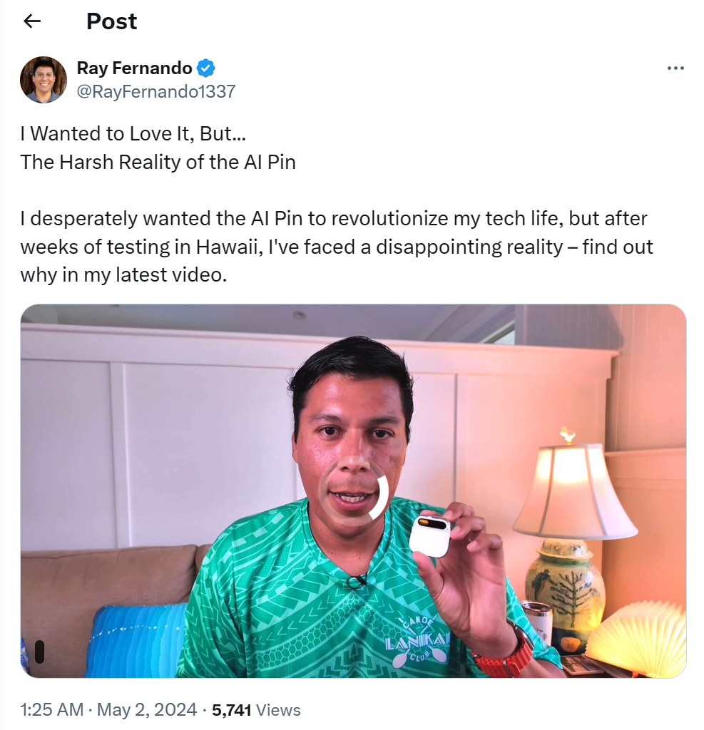 AI Pin是一款便携式 AI 设备,可以轻松别在衣物上。它通过激光投影技术在手掌上显示信息,内置 AI 助手能够通过语音命令进行网络搜索和通讯操作。AI Pin 还具备实时翻译功能,支持 50 种语言。《时代》杂志将其评选为 2023 年最佳发明之一,不到一个月预定量就超过了 450 万台。但随着第一批媒体评测解禁,大家的体验出奇的统一:美丽的废物,别买。华尔街日报记者吐槽了产品发热严重,以及激光交互在户外不能用。科技博主MKBHD 更加直接,视频标题写道:AI Pin 是他评测过的最糟糕的产品。据MKBHD 测试,AI Pin 续航时间仅为 2-4 小时;而且 AI Pin 小巧的体积带来了散热问题,不少媒体评测的时候都提到过,使用没多久 AI Pin 就提示“过热关机”;有媒体猜测,这是因为 AI Pin 要反复搜索信号所以发热。并且 AI Pin 的交互方式,繁琐且低效。在 AI Pin 在实际使用中,手势识别的准确率并不高。![]()