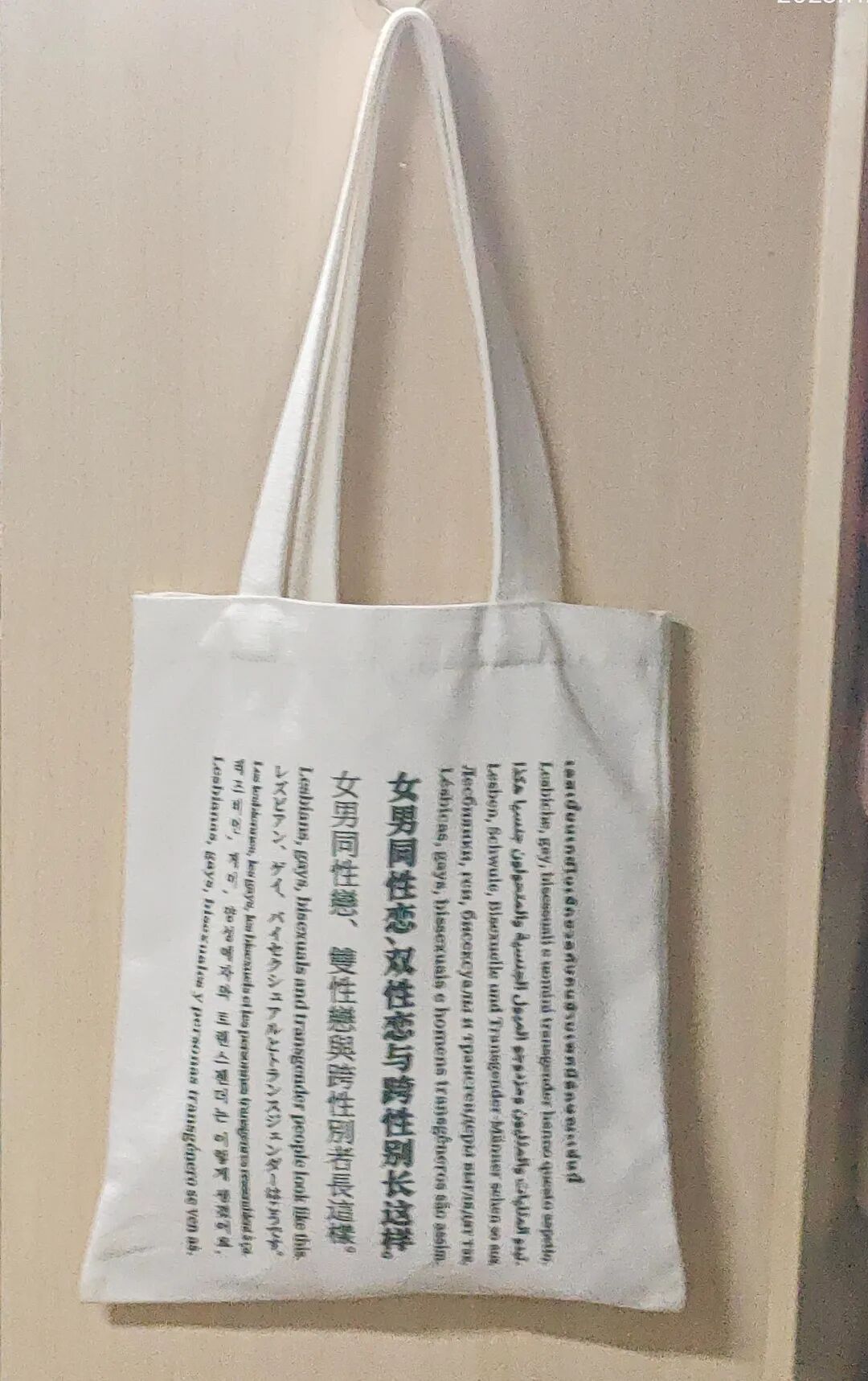 “性少数长这样”帆布袋两面文印,一面是标志支持同志平权的彩虹旗,另一面是用13种文字表达的:“女同性恋、男同性恋、双性恋与跨性别长这样。”
